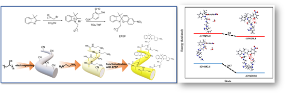 成果1:Porous Electrospun Films with Reversible Photoresponsive Microenvironmental Humidity Regulation: A Controllable Hydrogen Bonding Synergistic Effect Exhibited by Acrylic Acid Segments.ACS Appl. Mater. Interfaces(中科院二区TOP期刊)。该研究利用羧基与螺吡喃的协同效应,通过Cassie理论和密度泛函理论,计算解释了材料的吸水过程和羧基对材料吸放湿过程中的影响,材料的最佳调节湿度范围是没引入丙烯酸材料的2倍左右,达到12.5%。