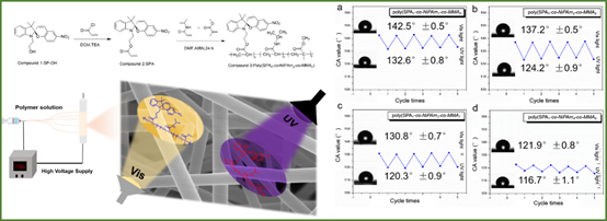 成果3:Photoresponsive Electrospun Nanowire Films Based on N-Isopropylacrylamide and Spiropyran for Regulating Microenvironmental Humidity.ACS Appl. Nano Mater.(中科院二区期刊)。该研究通过在聚合物链中引入N-异丙基丙烯酰胺,得到氮协同增强的湿度调节材料,调节湿度范围可达到7.2%。
