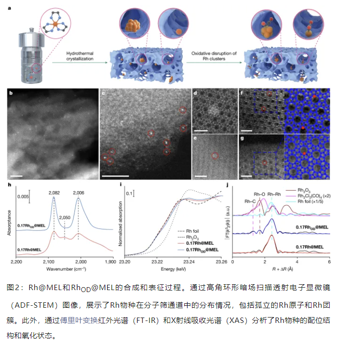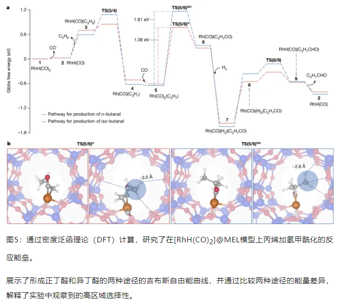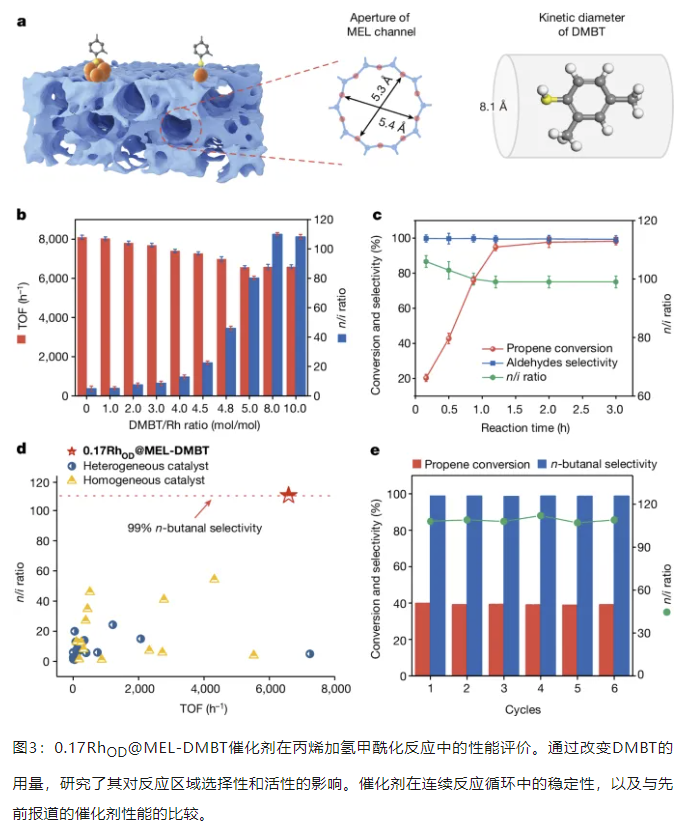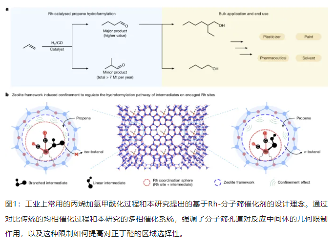 本研究成功开发了一种新型的Rh-分子筛催化剂,通过将Rh物种封装在MEL分子筛框架内,实现了对丙烯加氢甲酰化反应的高区域选择性。优化后的催化剂在产物形成周转频率(TOF)达到6,500 h−1时,对正丁醛的区域选择性超过99%,对醛的总选择性也超过99%,显著优于之前报道的异质和均相催化剂。通过一系列实验和理论计算,研究揭示了分子筛框架对中间体反应路径的引导作用,以及通过限制效应实现对正丁醛的高选择性形成。此外,催化剂在连续流实验中显示出优异的稳定性和可回收性。这项工作不仅为合成高选择性的加氢甲酰化催化剂提供了新策略,也为理解和设计分子筛限制的金属催化剂提供了重要的基础。