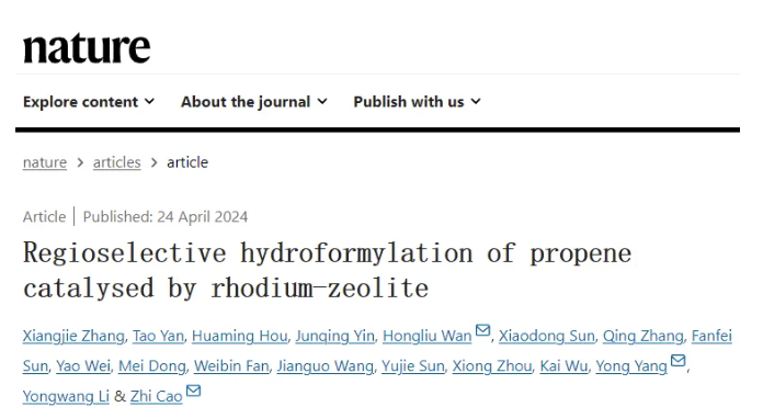 1998届校友杨勇以通讯作者在《Nature》发表论文。该研究利用多相“铑-分子筛”负载型催化体系,首次实现了丙烯氢甲酰化以超高区域选择性制取出正丁醛。该团队将经典的分子筛骨架对反应中间体的“择形效应”拓展应用至分子筛骨架与结构清晰的铑活性位点之间形成的狭小限域空间,通过抑制在氢甲酰化反应中生成具有较大空间位阻的异丁醛中间体,实现了对目标产物正丁醛超过99%的区域选择性,同时醛类产物总选择性也高于99%,催化剂转化频率超过6500 h-1。上述催化性能结果超越了迄今为止报道的所有多相催化剂和几乎所有的均相催化剂。该研究不仅为如何通过多相催化的方法选择性获取热力学上更不稳定的反马式加成产物——正丁醛提供了一种新方法,也进一步拓展了经典分子筛骨架“择形催化”这一概念,也为目前丙烯氢甲酰化工业生产中存在的巨大挑战提供了新的解决思路与方法。4月24日,相关研究成果发表在《自然》(Nature)上。本研究工作得到国家重点研发计划、国家自然科学基金、中科合成油技术股份有限公司研究基金等的支持。