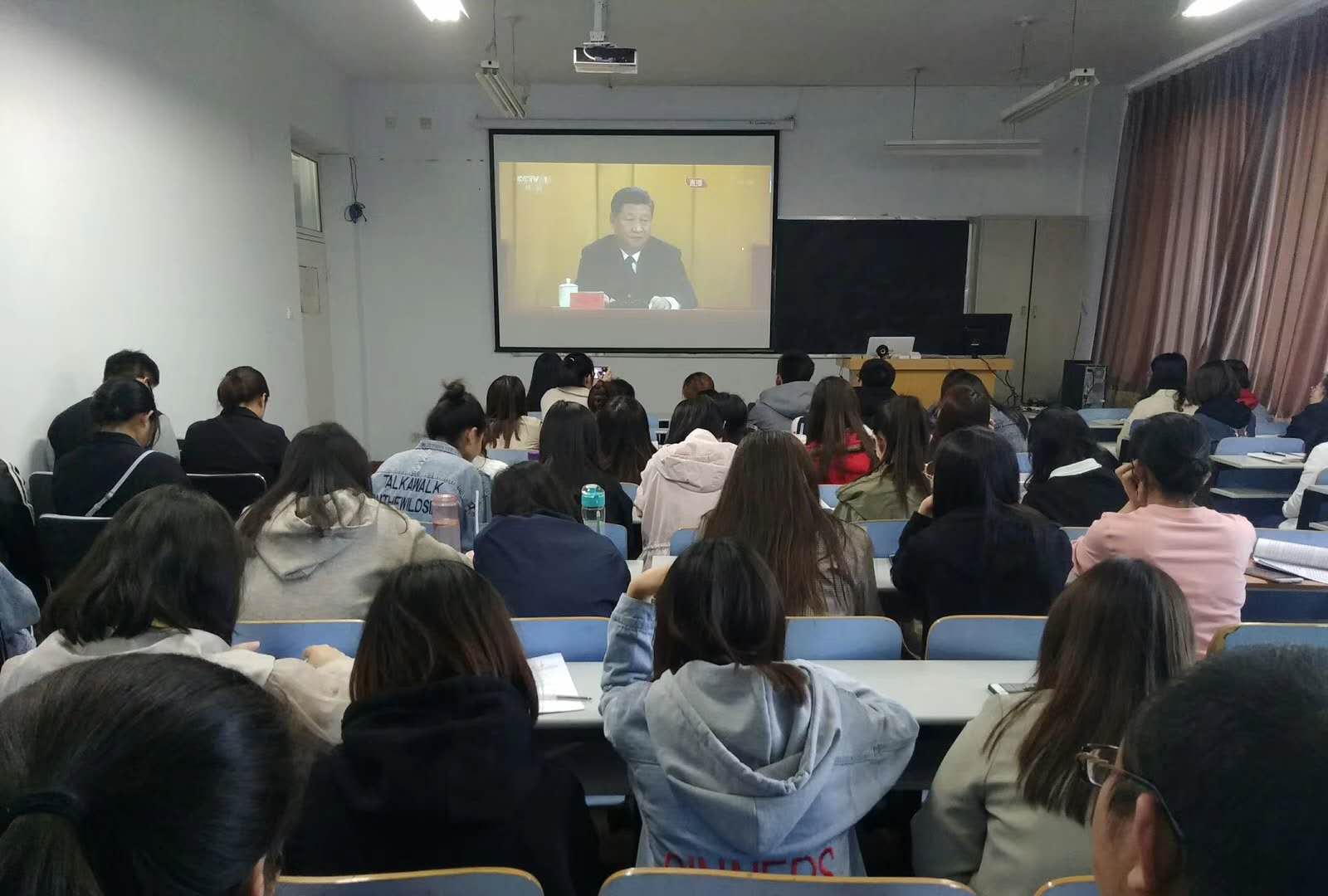 党委书记刘子忠,院长贾美林,副院长包永胜,各教研室主任、任课老师、班主任、团学干部、辅导员,研究生、本科全体学生党员及部分团员共同收看习近平总书记在大会上发表的重要讲话。学习讲话内容,领会讲话精神。