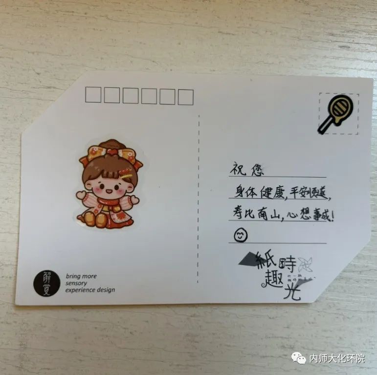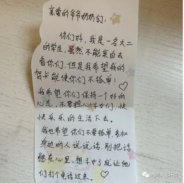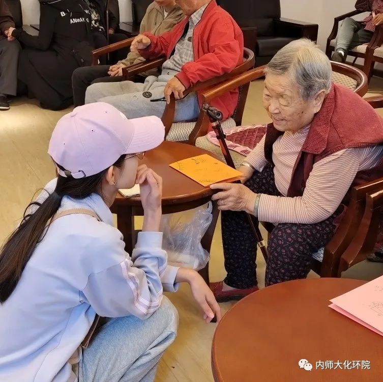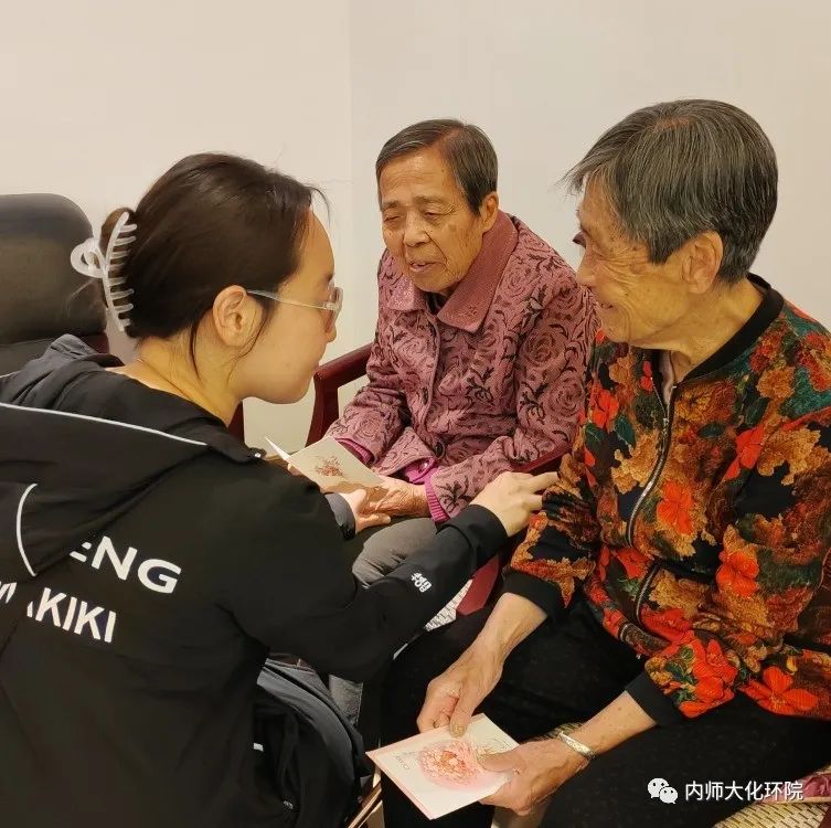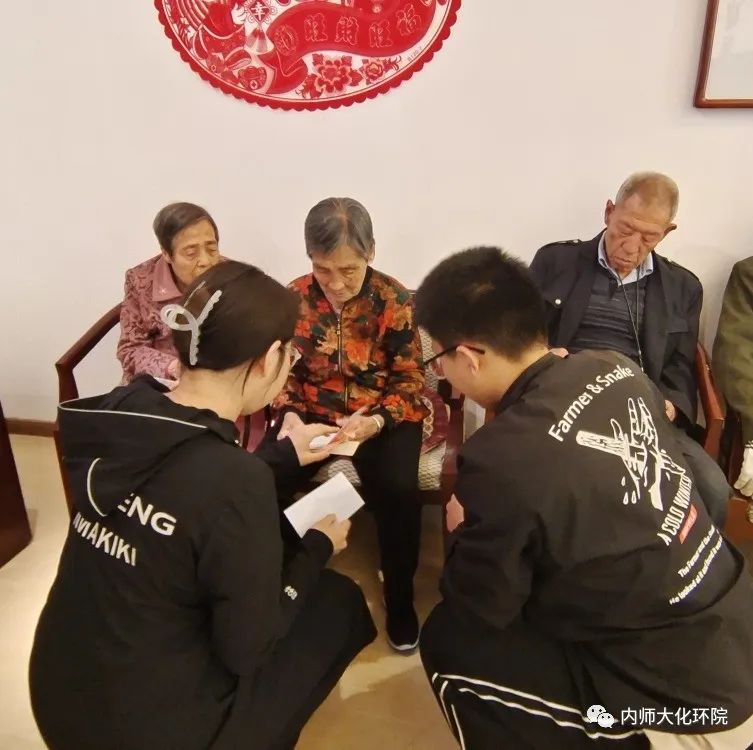 志愿者同学们怀着诚挚之心,带着慰问品来到敬老院。志愿者们把老人搀扶到院子里,向老人们介绍了来敬老院的目的并为老人们送上了一些日常生活用品以及40余名同学写给老人们的祝福贺卡。在交谈时,志愿者认真倾听老人们讲述着改革开放前后的个人经历,深刻地了解到今天的幸福生活来之不易。最后,志愿者们与老人们一同合影。屋内暖意融融,活动在大家的欢声笑语中结束。