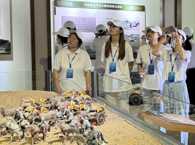 讲解员详细地讲述了磴口县三盛公粮库旧址博物馆展厅里的丰富内容。同学们了解到这座博物馆是内蒙古自治区首个以粮食仓储文化为主题布展的博物馆,通过大量的实物、文字、图片、场景等陈展形式,全面展示了边塞粮仓的历史及其仓储文化。