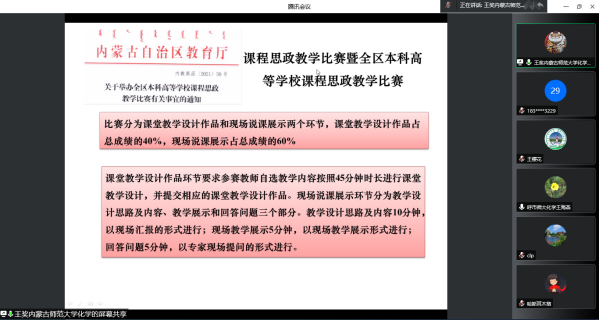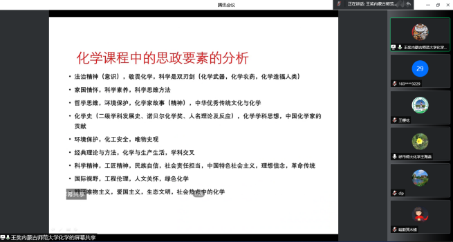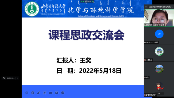 2022年5月18日晚上7:30-8:00,王奖老师给教法化工教研室的所有老师进行课程思政方面的经验交流。本次会议由王海燕老师主持。