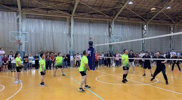 清脆的哨声响起,比赛正式开始了,赛场上的老师们精神饱满、配合默契、沉着冷静、积极拼抢,展现出精湛的球技和良好的团队意识。高高抛起的排球,熟练的叠拳,轻轻迎击,打出清脆的声音,划出一道完美的弧线,完美的扣杀,不时将比赛推向高潮,气氛十分热烈。