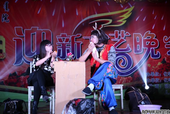 12级化汉小品《宿舍风波》左起:何雪薇、麻鸿鹏