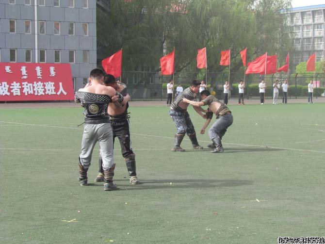 院长长山教授主持开幕式,学院党总支书记莎仁教授致开幕辞。开幕式上裁判员代表和运动员代表分别宣誓,2012级新生代表队表演了广播操,2012级化学蒙班呼和牧仁等同学表演了蒙古族博克,2010级和2011级同学组成运动队表演了精彩的健美操。其中蒙古族博克最为引人注目,同学们对蒙古族博克传统有了更深了解,表演中掌声不断,深受同学们的喜爱。随后100米的枪响拉开了整个比赛的序幕。在这一天中,运动员们在赛场上发扬顽强拼搏、坚忍不拔、团结进取、勇于竞争的精神,他们将理想放飞、将激情燃烧、将辛苦和汗水折射成最绚丽的光芒。