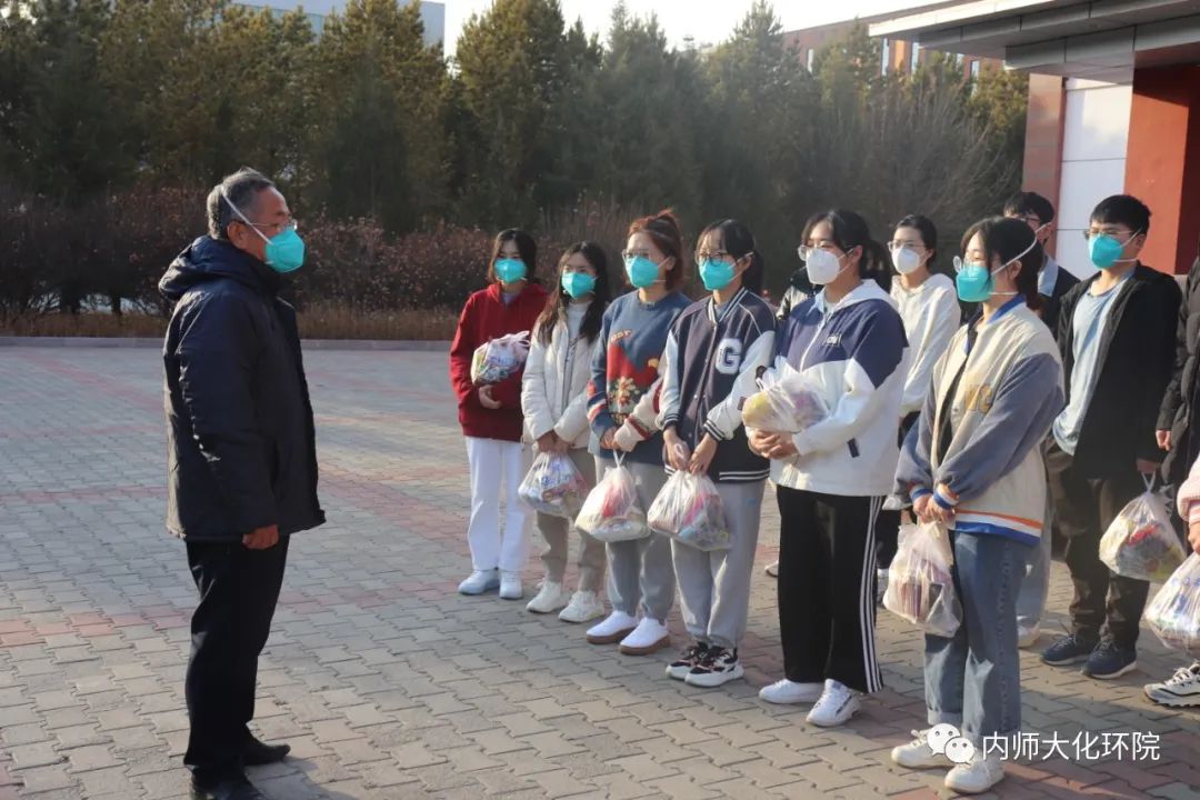 在慰问过程中,刘子忠书记表示:在疫情防控工作中,核酸检测志愿者们分工明确,各尽其责,充当“讲解员”、“疏导员”、“信息采集员”等众多角色,出色完成了核酸检测工作任务。范磊老师也表示:化环学子应当以志愿者们作为榜样,共同发扬“奉献,友爱,互助,团结”的志愿服务精神,站好最后一班岗,用实际行动贡献青春力量,彰显青年人的使命担当。