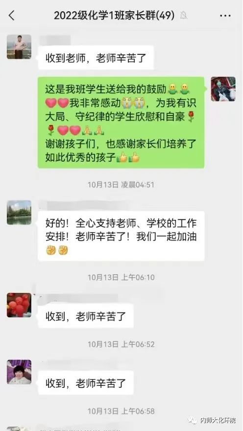 坚决贯彻自治区党委和学校党委的决策部署,家校合一,团结一心,共克时艰。一句句“谢谢老师”、一声声“老师们辛苦了!”都是家长们对学校和老师工作的肯定与支持,更是老师们工作的强大动力。家长们在表达对老师及学校感谢的同时,也希望老师们能做好防护,早日与亲人团聚。与此同时,在得知学生志愿者为同学们所做的贡献时,家长们也纷纷对他们表示感谢,并且鼓励孩子向他们学习,多多参与志愿活动为同学们服务。不少志愿者同学也表示:当前疫情防控形势依然严峻,作为青年大学生,要用行动践行青春,用行动展现担当,为学院的疫情防控工作奉献自己的青春力量,参与志愿活动的脚步也会一直向前。