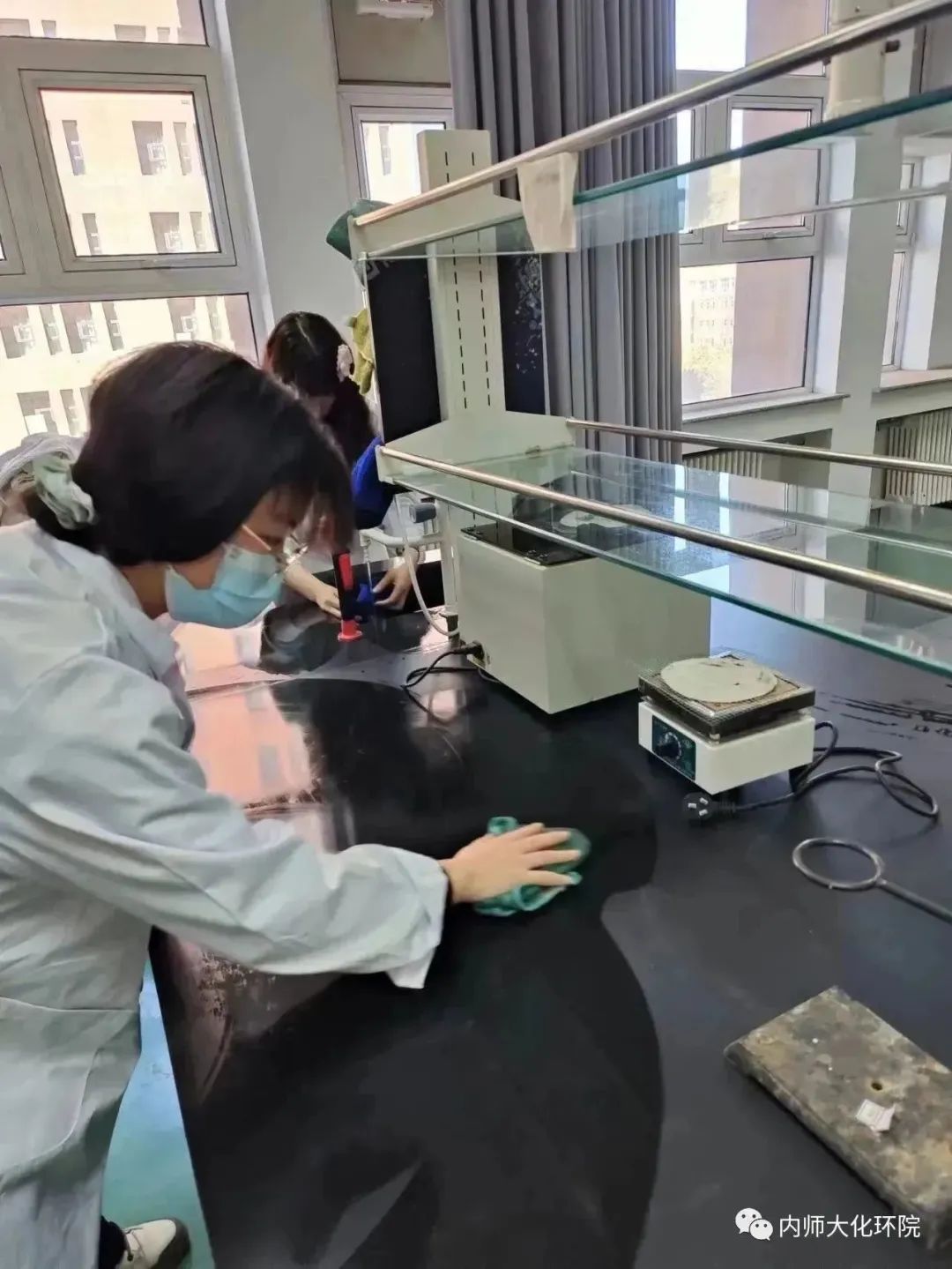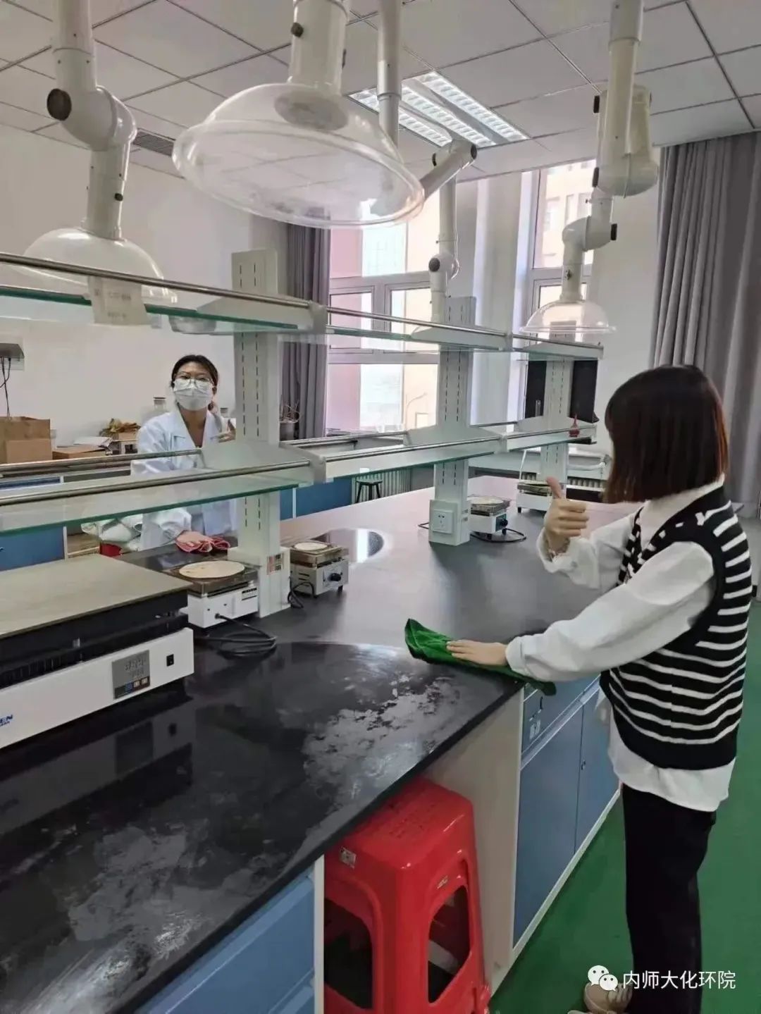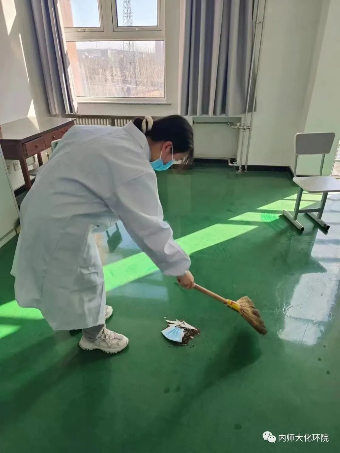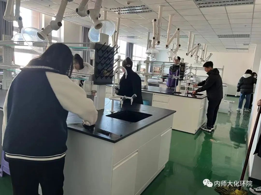 2022届的同学们负责清洁无机、教法实验室。实验室里,同学们扫地、拖地、整理实验器具和药品,并对实验台进行消毒。在实验室老师的指导下将堆积的仪器等物资进行整理,小心地摆放到指定地点。学生会与志愿者服务队的同学们对办公区进行了彻底细致的清扫及消毒。整个清洁过程中,同学们不放过任何一个角落,爱室如家,干劲十足。每个人都做到了各尽其职,各负其责,大家齐心协力把理工楼打扫的焕然一新、整洁明亮。