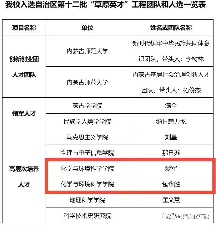 近日,自治区第十二批“草原英才”工程项目评审结果公示,在高层次培养人才的项目中,番茄视频 教师包永胜、爱军成功入选高层次培养人才。
