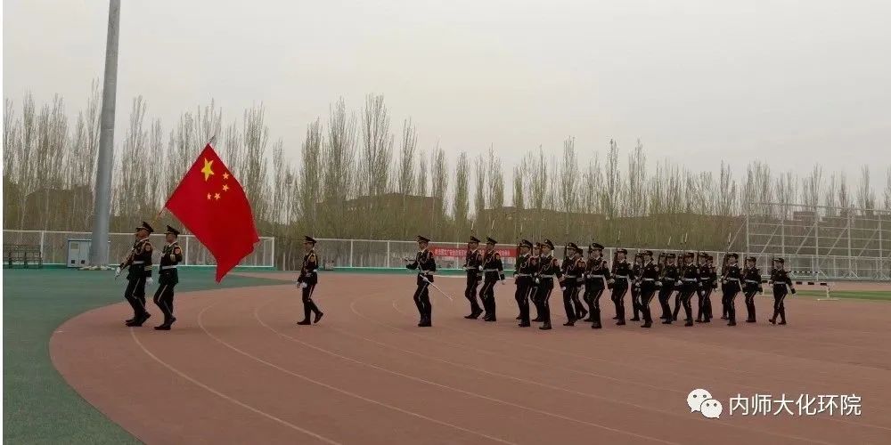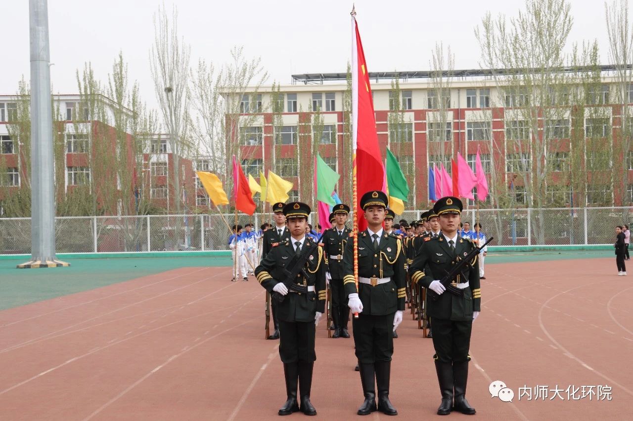 升国旗,奏唱国歌。全体师生满怀壮志,肃立在升旗仪式现场,向国旗行注目礼。