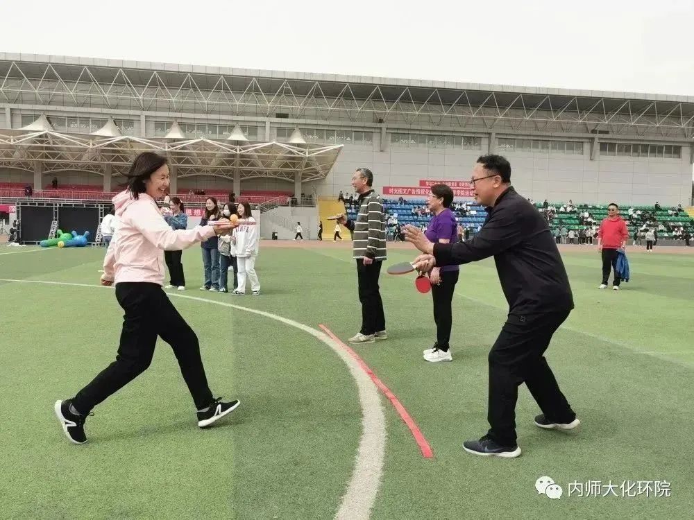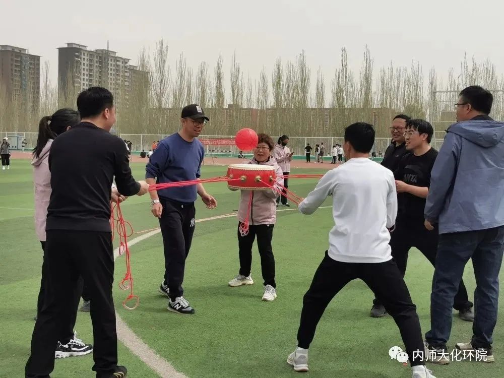 同时,教职工趣味运动比赛在操场中央进行。击鼓颠球、同舟共济赛龙舟、端乒乓球走、男女混合接力等各式有趣的比赛让平时在课堂上严肃认真的老师们都大显身手,玩得不亦乐乎。精彩的比赛也吸引了很多同学的围观和喝彩。