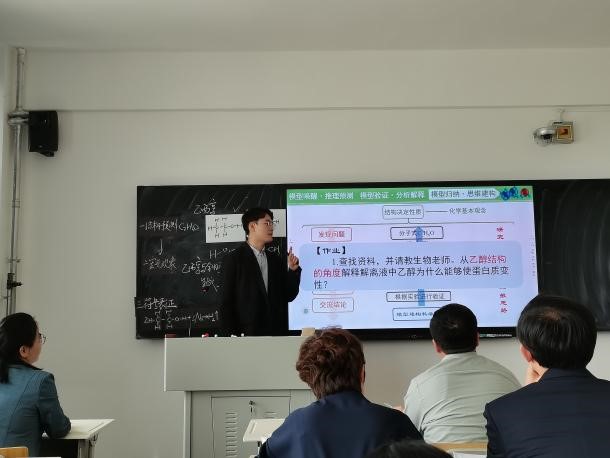 本次比赛的参赛选手共有30名,每名同学的教学展示时间为10分钟。在近6小时的展示环节中,选手们都展现出了作为一名教育硕士研究生应有的风采,虽然仅提供了黑板、粉笔、多媒体等基本教学设施,但选手们并没有受到客观条件的限制,有的选手现场进行了演示实验,还有选手用到了球棍模型、黑板贴、虚拟仿真实验等教学工具和手段。在各位参赛选手的精心准备下,教学展示环节精彩纷呈。