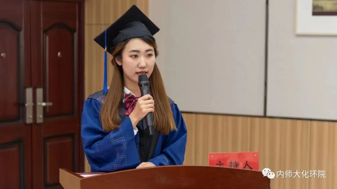 2019级化学汉二班孙阳同学代表本科毕业生发言。她感谢学院对她的培养,讲到毕业不是终点,而是新的起点,要勇敢面对挑战,追求自己的未来,牢记总书记嘱托,在新时代创造业绩。