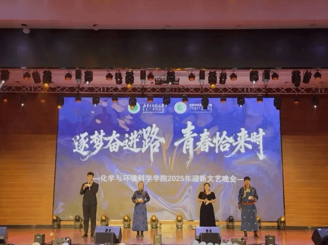 于学生事务中心二楼多功能演播厅隆重举办了2025级“逐梦奋进路·青春恰来时”主题迎新晚会。师生欢聚一堂,气氛温馨而热烈。党委副书记(负责人)、副院长范磊、副院长包永胜、化学系主任王帅老师、环境系主任代钢老师、无机化学教研室主任王莎莎老师、李杲老师、有机化学专业特格希老师、研究生班主任张阳老师、学就办主任白赛纳老师、2025级新生班主任以及番茄视频