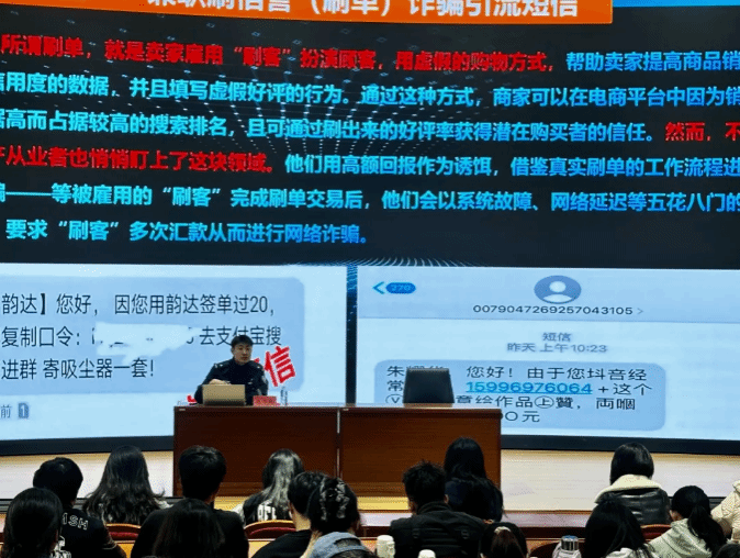讲座中,赵书锐警官结合当前电信网络诈骗犯罪的新形势、新特点,围绕反诈相关政策法规展开细致解读,让同学们清晰掌握反诈工作核心要求与自身维权途径。同时,通过剖析多起真实典型案例,深入拆解刷单返利、虚假购物、冒充客服、校园贷、冒充公检法等常见诈骗手段,详细揭露诈骗分子的作案套路与话术陷阱,用鲜活案例为在场同学敲响安全警钟。