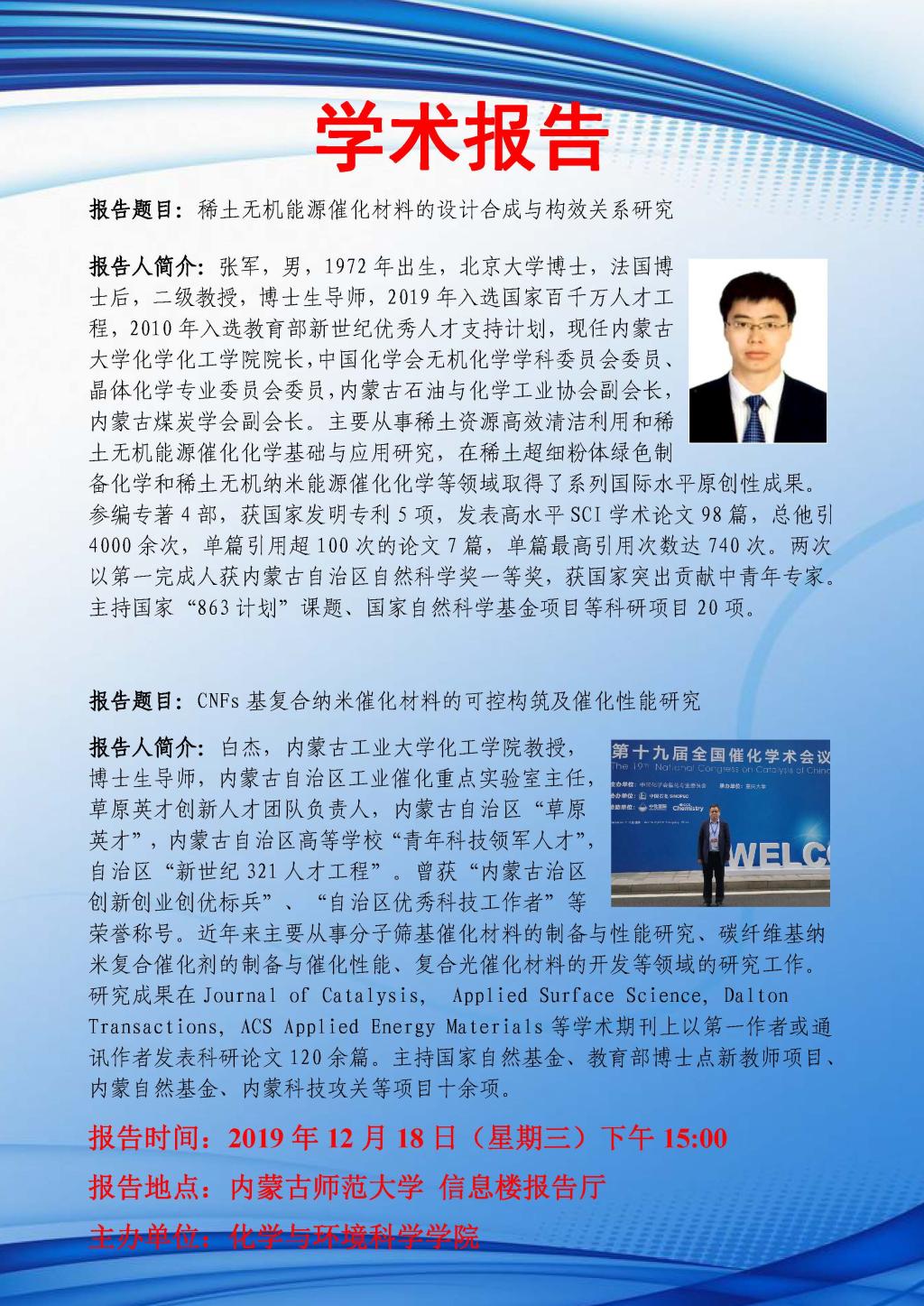 2019年11月18日,应番茄视频 贾美林院长邀请,内蒙古大学张军教授、内蒙古工业大学白杰教授来番茄视频 进行学术交流访问。两位教授分别作了题为“稀土无机催化材料的设计合成与构效关系研究” 和“CNFs基复合纳米催化材料的可控构筑及催化性能研究的学术报告”的学术报告。学术报告由贾美林院长主持,番茄视频 包永胜副院长、乌云教授、德格吉呼教授、李北罡教授、白音孟和教授等多位教师与研究生参加了报告会。