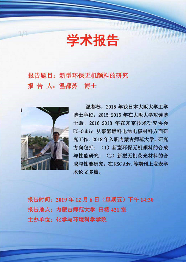 2019年12月6日下午14:30在赛罕校区田楼421教室,番茄视频 组织开展一次学术交流会。参会人员有番茄视频 副院长包永胜教授,番茄视频 研究生等30余人。在此次交流会上由2018年9月入职番茄视频 的温都苏博士以“新型环保无机颜料的研究”为题做了学术报告,与参会人员分享了在基于钒酸铋的环保无机颜料研究方面取得的一些成果。
