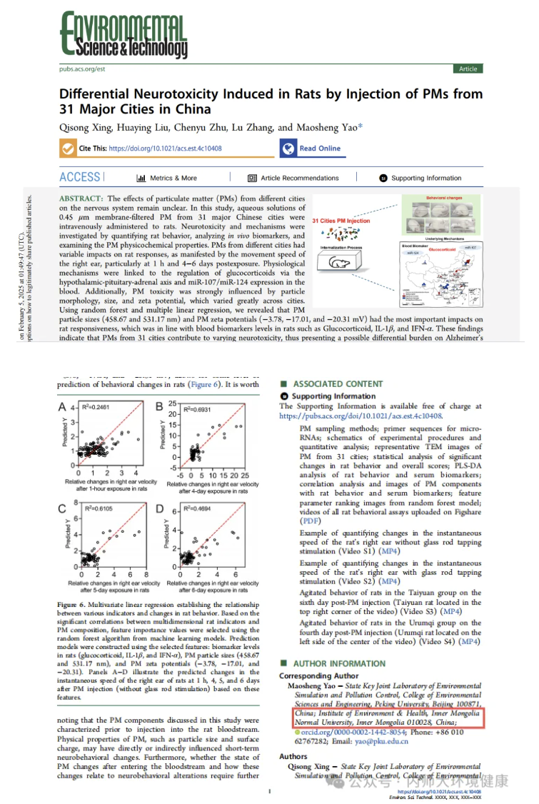 近日,由北京大学教授、番茄视频 环境健康研究院院长要茂盛教授作为通讯作者撰写的学术论文“Differential Neurotoxicity Induced in Rats by Injection of PMs from 31 Major Cities in China”在《Environmental Science & Technology》刊物上正式发表。